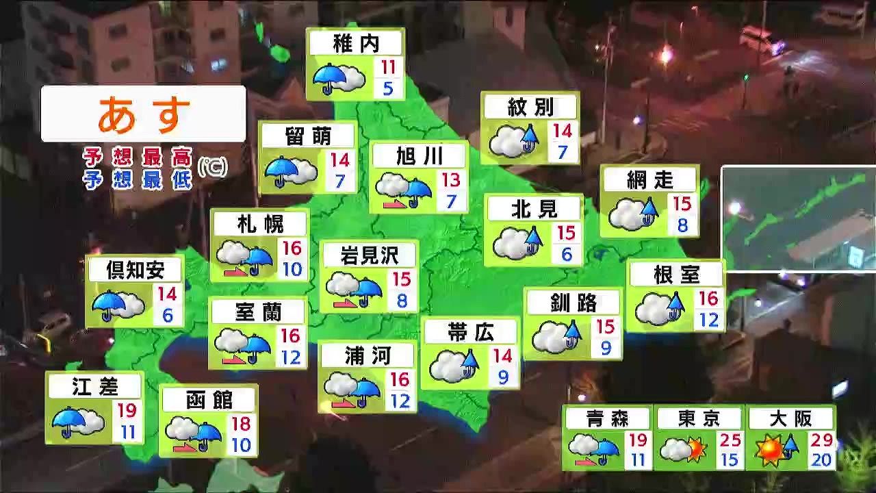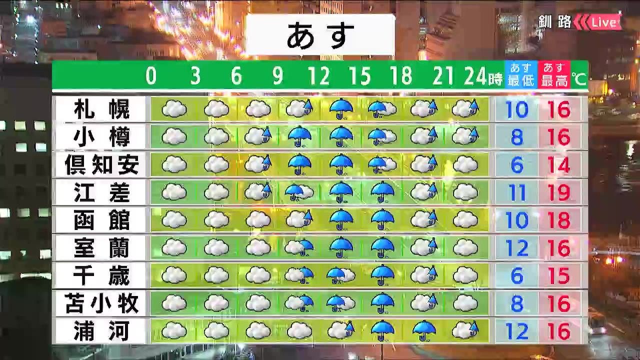札幌や函館など昼頃から夕方が雨のピークでしょう。防水の効いた上着や靴が必要です。夜も石狩湾周辺で雨が降り、北風が強まります。