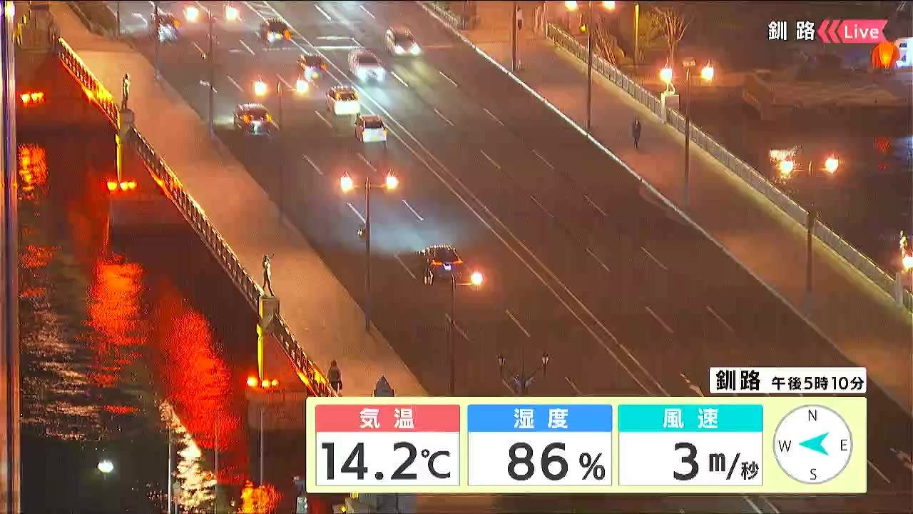 釧路です。日没時刻に合わせて、幣舞橋のライトアップが毎日行われています。タイミングによってきょう17日(金)は赤やオレンジになります。