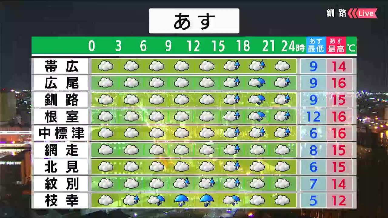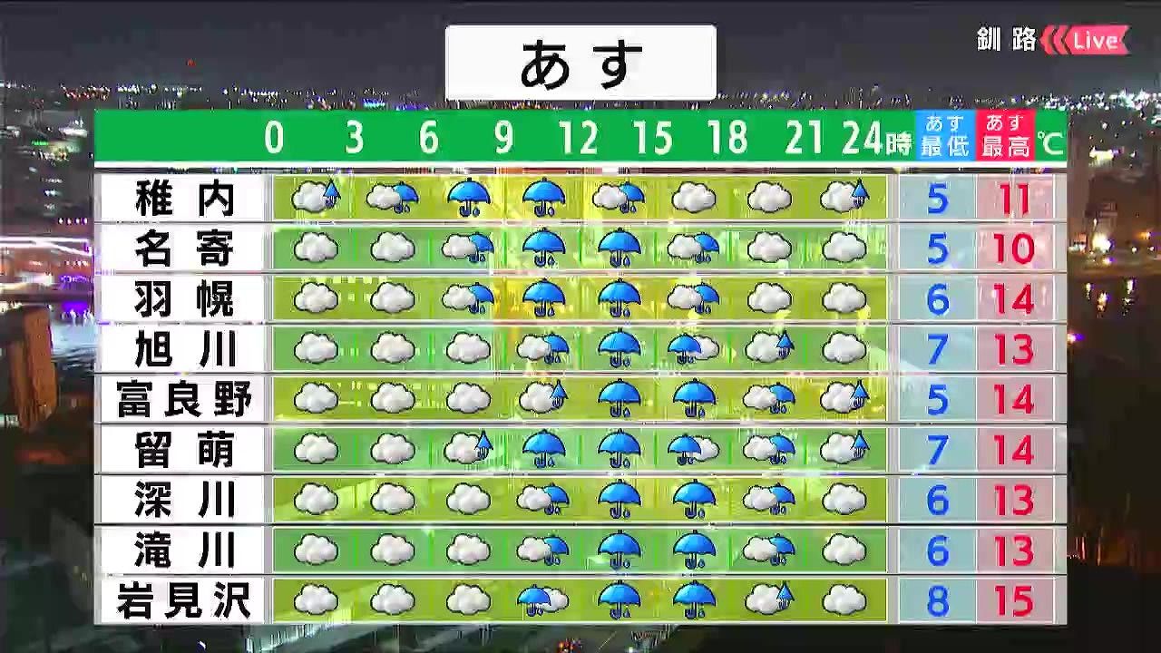 道北の枝幸や紋別は日中に雨、その他は夕方以降に雨が降るでしょう。日曜からの寒さに備えて衣替えや買い物などをしておきたいですね。