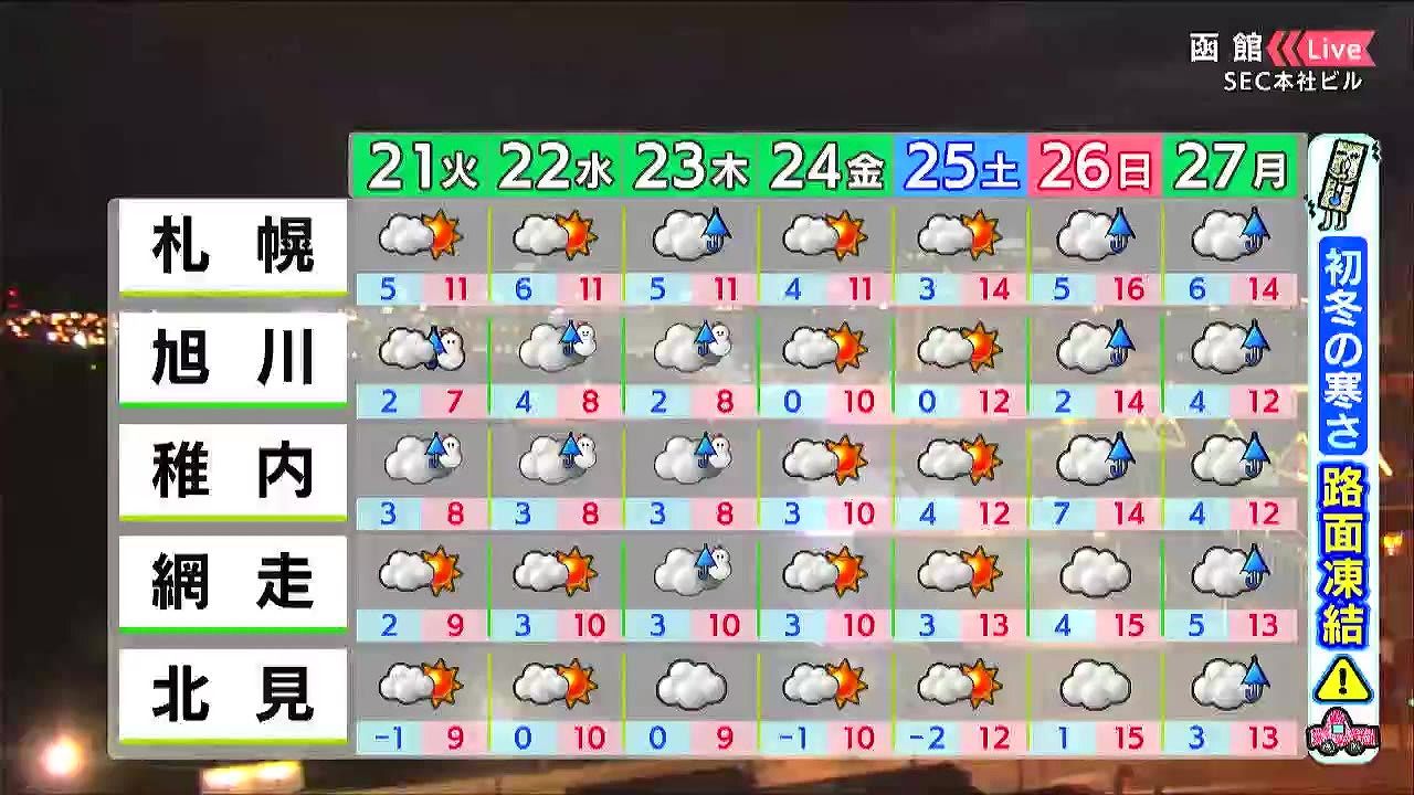 旭川や稚内は木曜まで湿った雪が降り、札幌や網走も木曜は雨や雪となりそうです。路面凍結に注意して下さい。日中の寒さは金曜日頃まで続くでしょう。