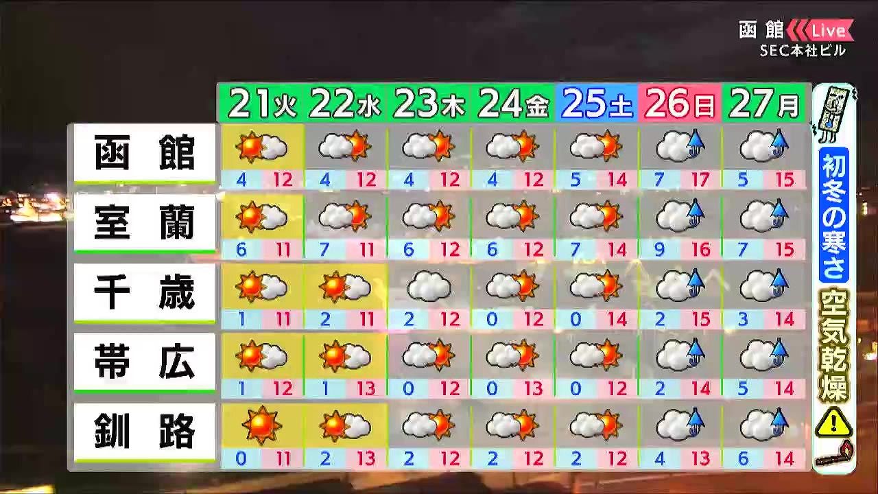 晴れても、金曜日頃まで11月上旬から中旬並みの寒さが続きます。空気がカラッとするため、ストーブなど火の取り扱いに注意が必要です。
