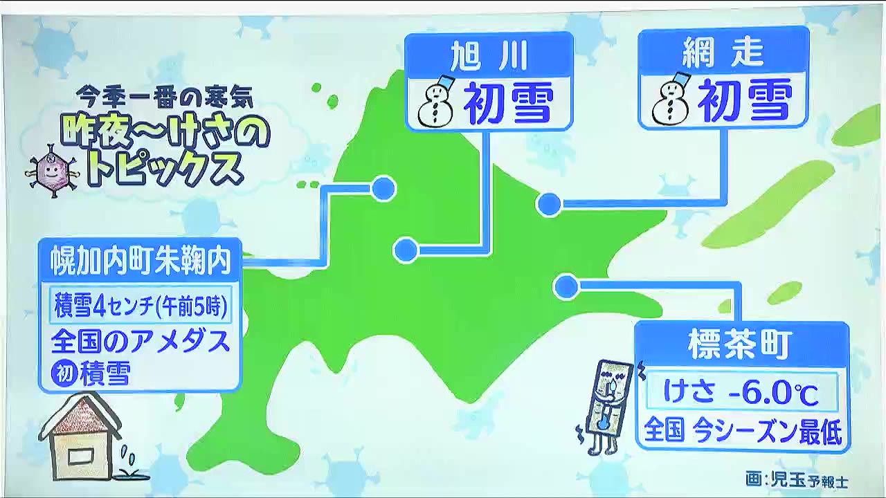 上空には今シーズン一番の寒気が流れ込んでいます。昨夜は旭川と網走で初雪を観測。けさは釧路中部の標茶町で全国の今シーズン最低となる‐6.0度を観測。また、上川北部の幌加内町朱鞠内では全国のアメダス地点で最も早く積雪を観測し、午前5時に積雪4センチを観測しました。