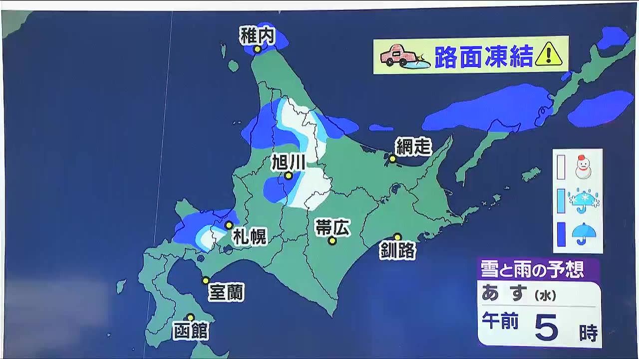 札幌や後志地方で明け方まで雨や雪が降るでしょう。日中は道南方面を中心に晴れる見込みです。寒さが続きます。ストーブの消し忘れに気をつけてください。