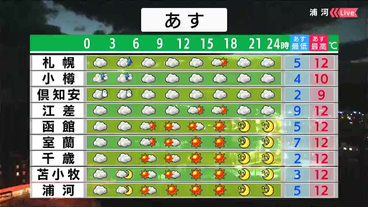 あす22日(水)の時間ごとの天気。道央・道南からです。