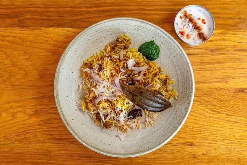 道南で丁寧に畜肉にしたヤギのビリヤニ。チャトニー(ミントのソース)が添えられており、付け合わせにはキュウリとトマトのライタ(味変するためのヨーグルトベースのソース)。表面には焦がしクミンとカイエンペッパーをまぶして。