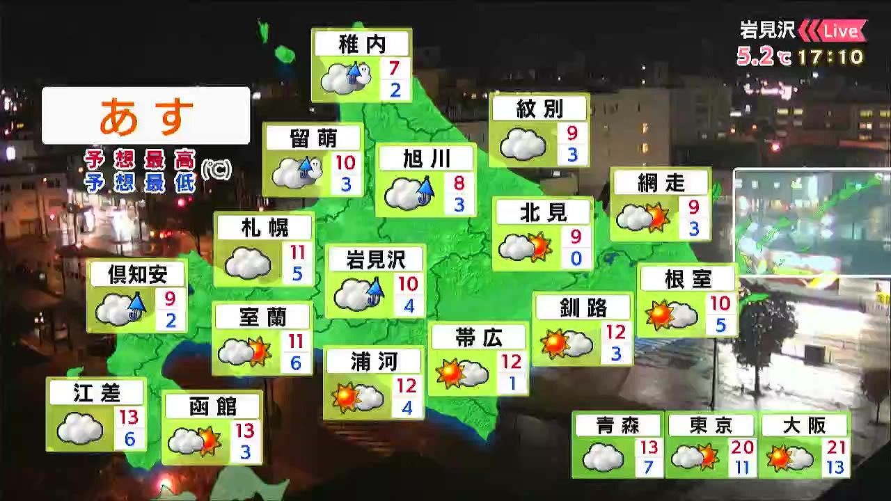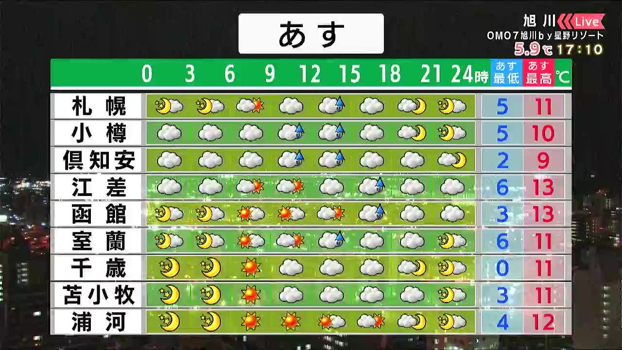 朝は日が差しますが、昼頃は札幌や小樽、室蘭方面で雨、夕方は渡島半島でも雨が降るでしょう。中山峠は雪がまじりそうです。