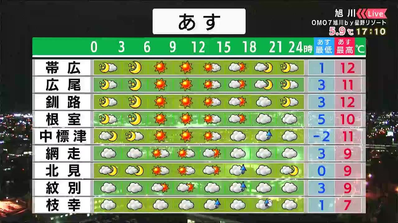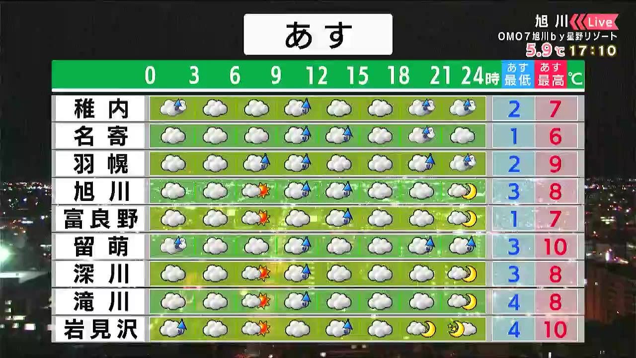 昼頃は各地で雨、夜は宗谷や留萌地方を中心に雨や雪が降るでしょう。最高気温は広く一ケタで、旭川は8度の予想です。橋の上など濡れた路面の凍結にも注意して下さい。