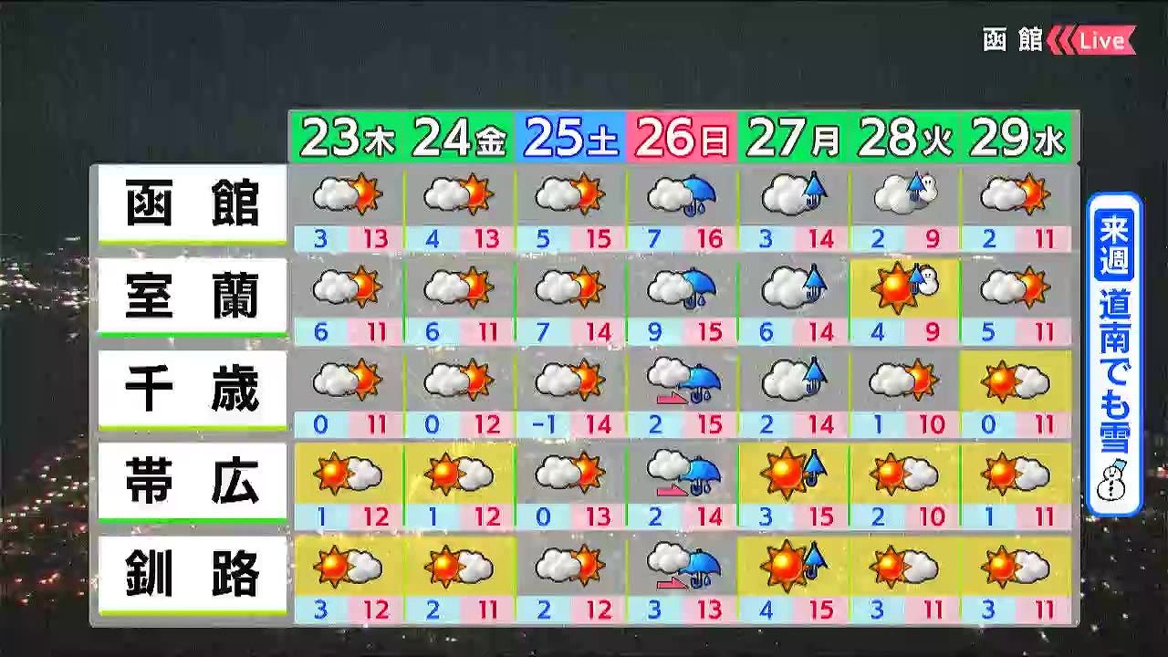 週末は一旦寒さが緩みますが、来週は再び寒気が強まり、道南でも雪が降りそうです。
