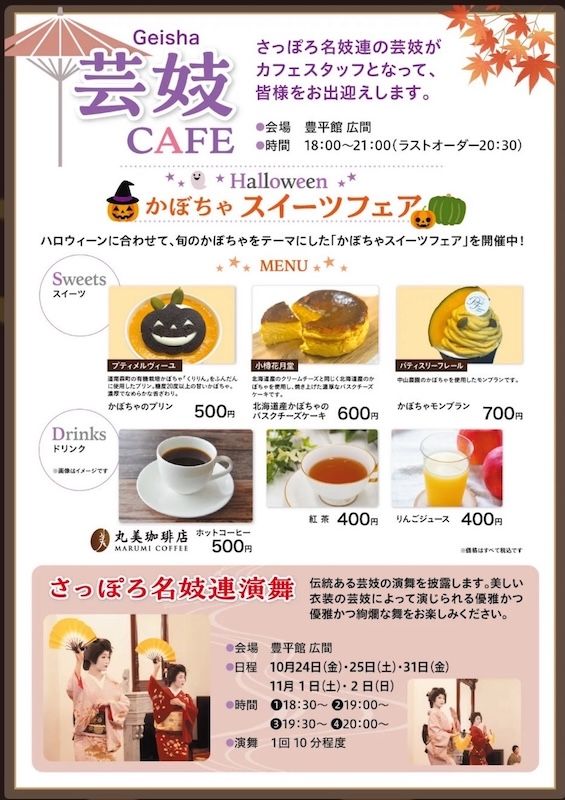 札幌の中島公園での紅葉ライトアップにあわせて、「芸妓CAFE」を開きます。