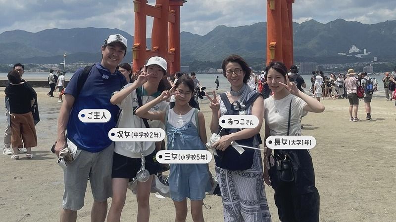 番組スタッフ:「お子さんは何人いらっしゃるんですか?」あつこさん:「子どもは3人います。大学1年生と中学2年生と小学5年生です」