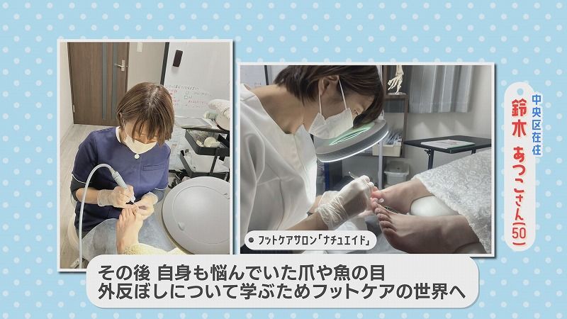 あつこさん:「フットケアサロンっていうのをやっていて…巻き爪とか、厚い爪とか、魚の目とか、そういう足のトラブル全般をお手入れするっていうお仕事をしています」