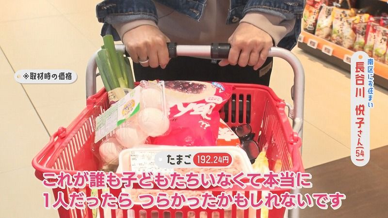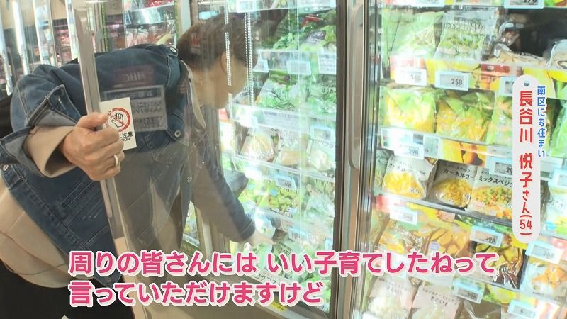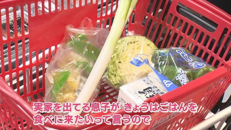 番組スタッフ:「いま何を買われていらっしゃいますか?」悦子さん:「実家を出てる息子が今日はごはんを食べに来たいって言うので。何を食べたいか聞いたら、野菜炒めが食べたいっていうのでそれに合うものを今探しているような感じです」