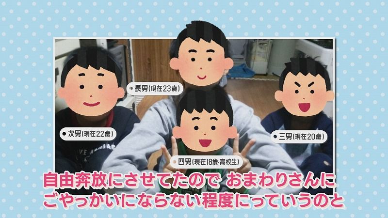 番組スタッフ:「4者4様な息子さん?」悦子さん:「そうですね。なので、なんで同じ親が育てたのに、みんな違うんだろうっていうのが感想ですね」