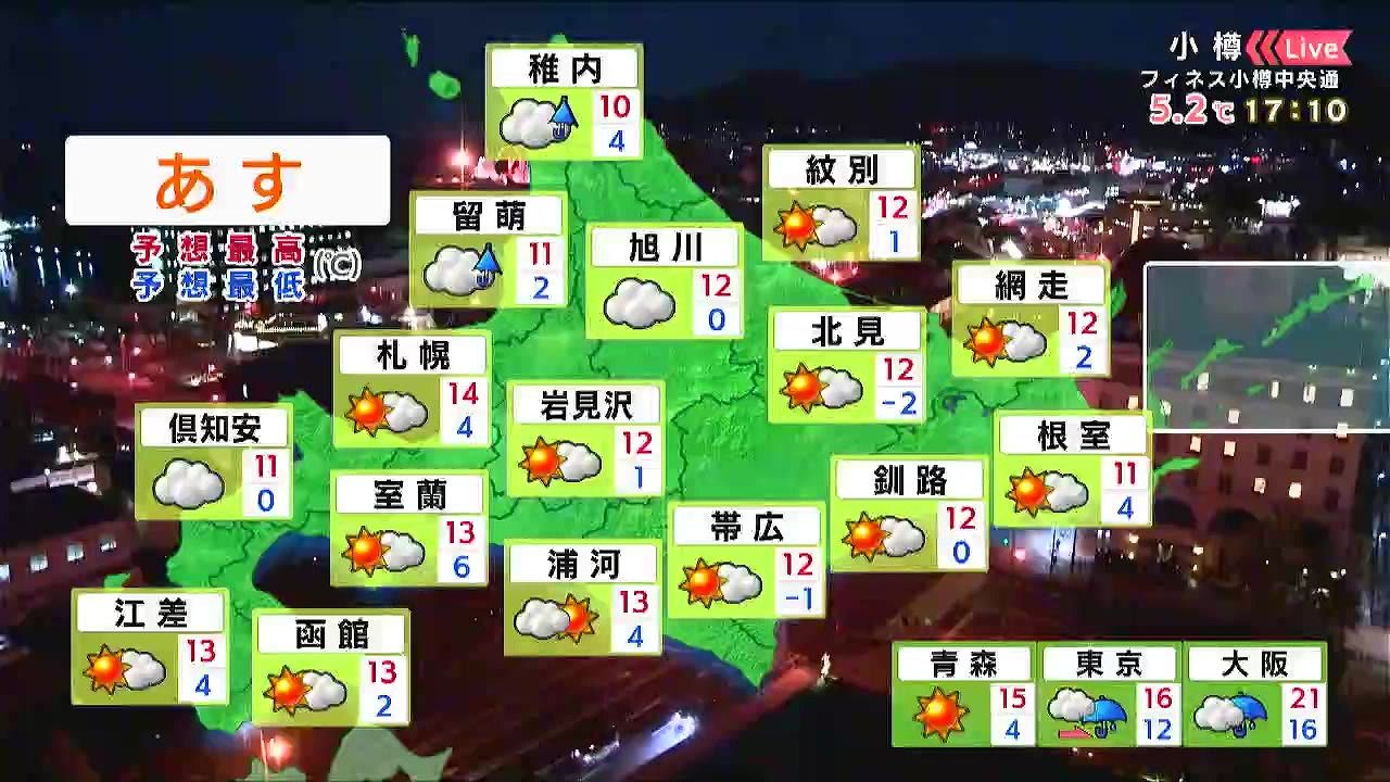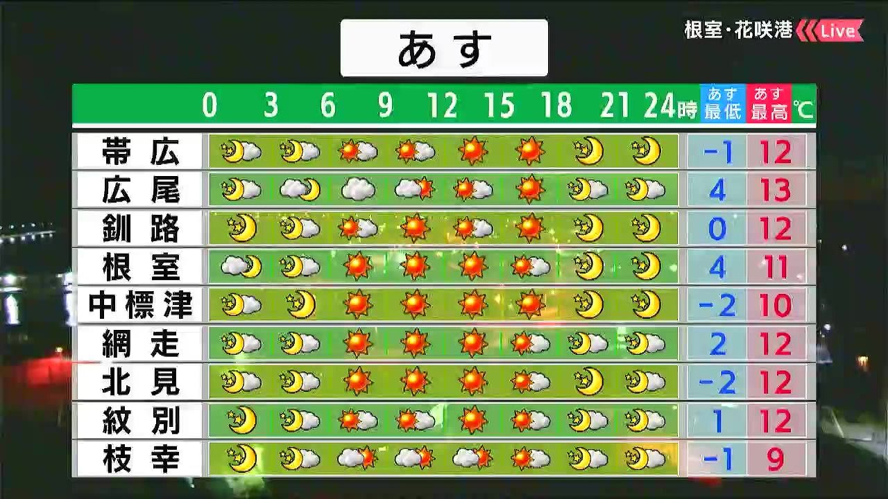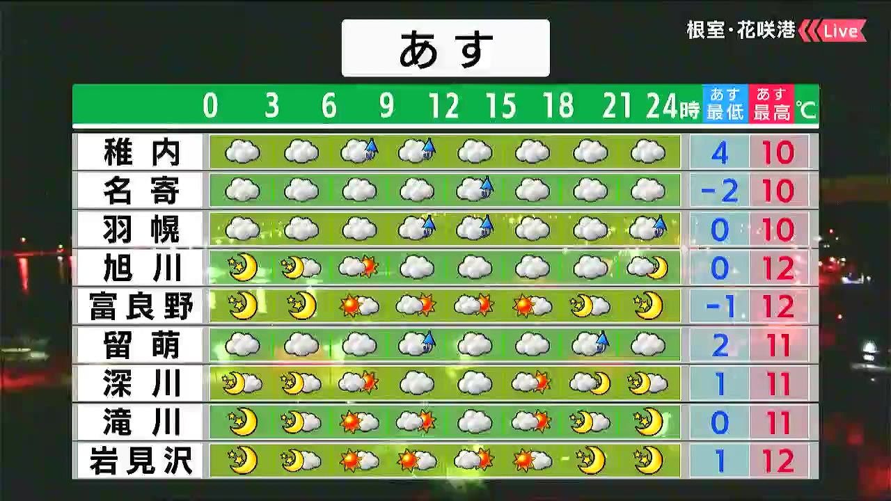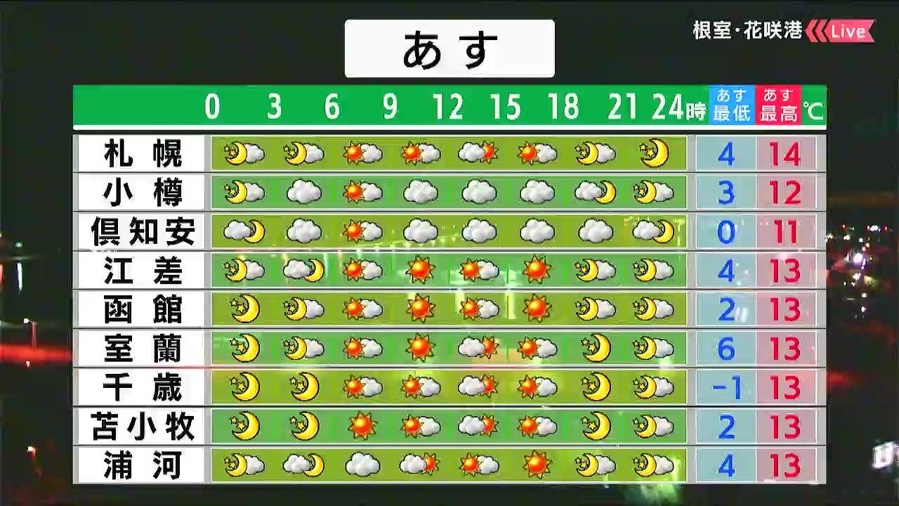 小樽と倶知安は日中雲に覆われますが、その他は日差しに温もりを感じられそうです。千歳は朝マイナス1℃まで冷えるので、今夜も暖かくしてお休みください。