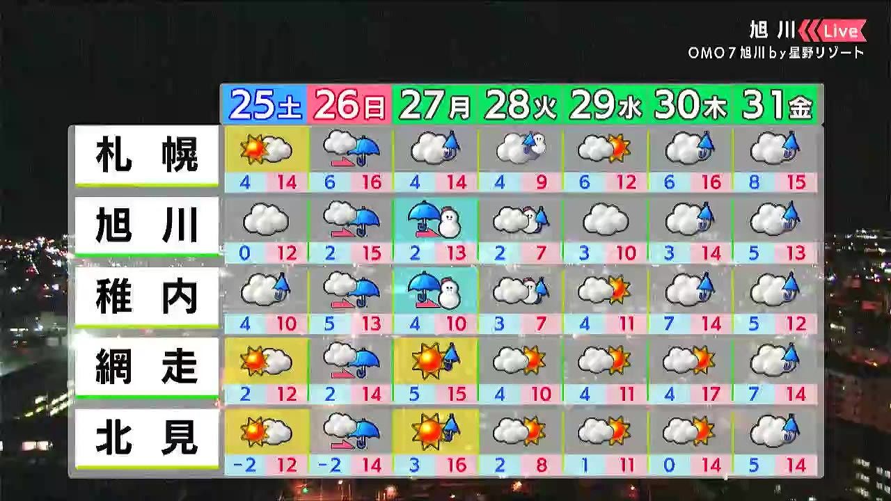 ※24日午後5時時点の情報です。最新の気象情報は、HBCウェザーセンターのホームページなどでご確認ください。HBCは気象庁の認可を2001年に得て以来、民間気象会社の一つとして「HBCの独自予報」を発信しています。