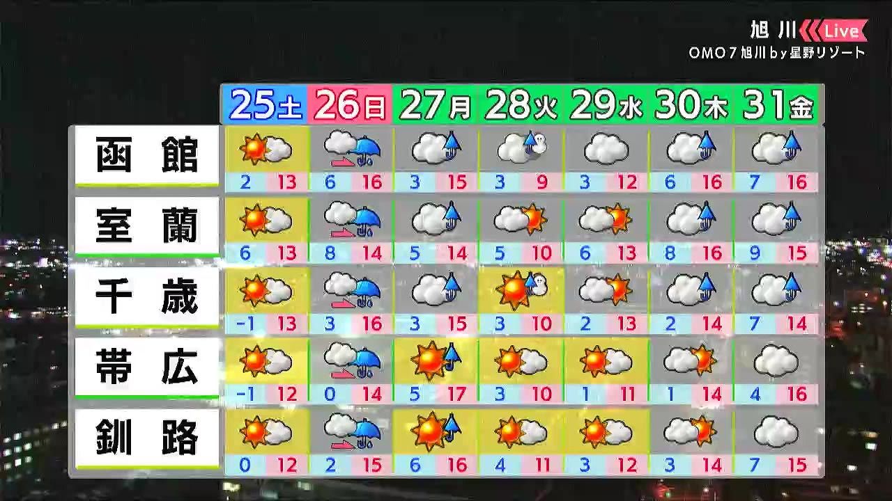 日曜日は午後を中心に雨で、月曜日は道北から雪に変わるでしょう。火曜日は寒気のピークで、札幌も雪になる時間がありそうです。また、風が強くふぶくこともあるでしょう。