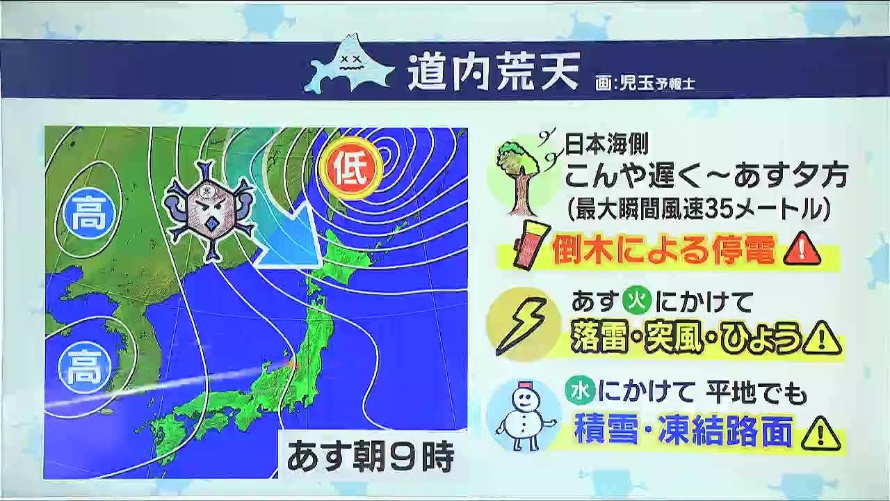 日本海側を中心に今夜9時頃からあす夕方にかけて最大瞬間風速35メートル、立っていられないほどの暴風の吹くおそれがあります。倒木などによる停電にも警戒して下さい。