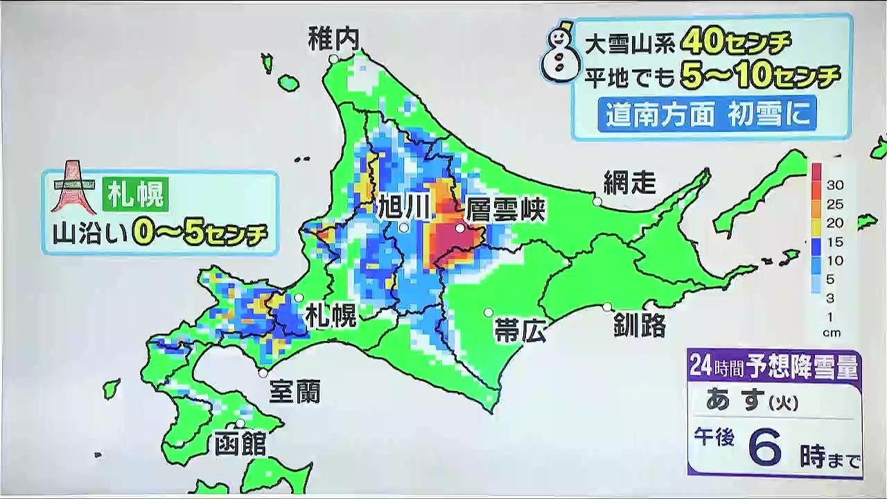 上川や空知、後志地方の平地でも5~10センチの雪が降り、函館や室蘭でもあすは初雪になるかもしれません。札幌中心部は雨に雪がまじる程度ですが、山沿いではうっすら白くなりそうです。