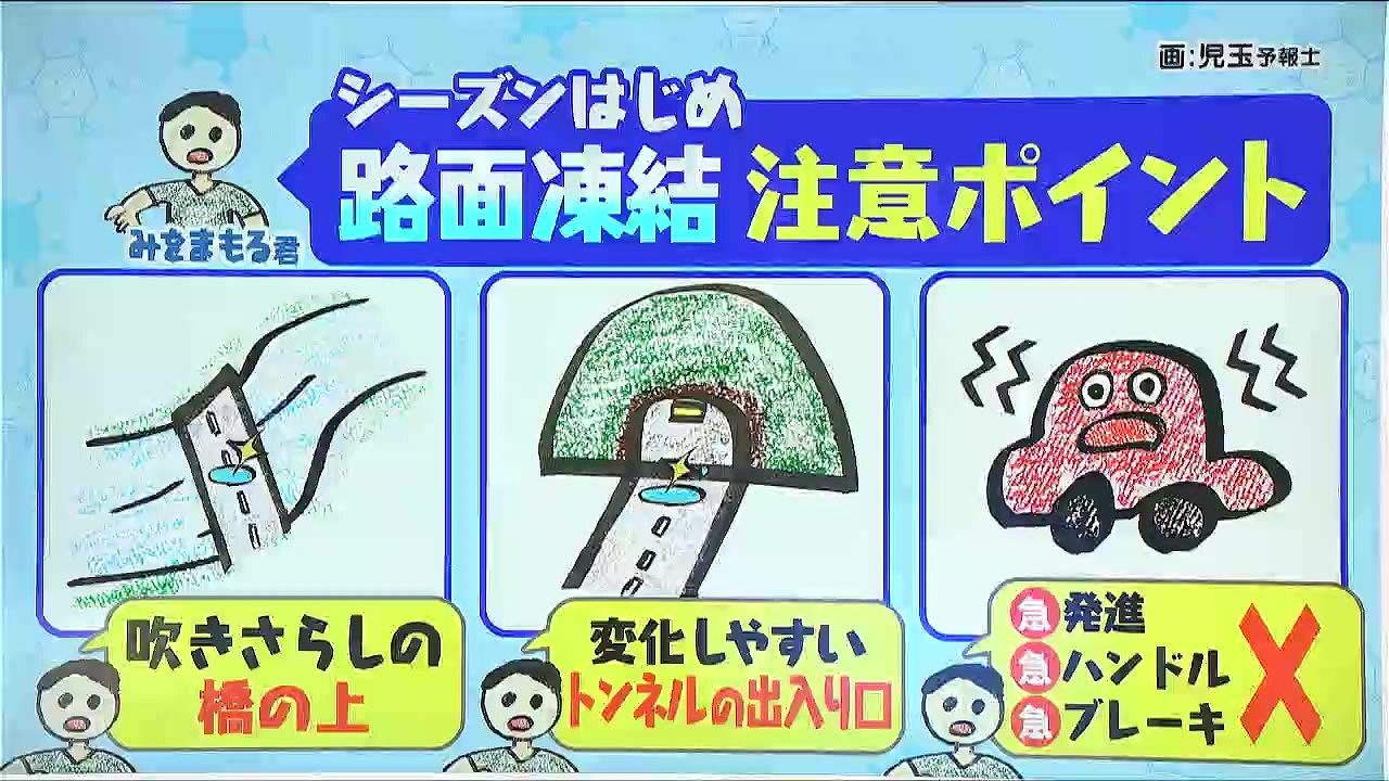 いま一度、凍結しやすい場所を確認しましょう。橋の上は、風が通り抜けて他の道より冷えやすいです。トンネルの出入り口は日陰になりやすいため注意が必要です。急発進、急ハンドル、急ブレーキ。「急」の付く運転は控えましょう。今後の詳しい見通しはこのあとお伝えします。