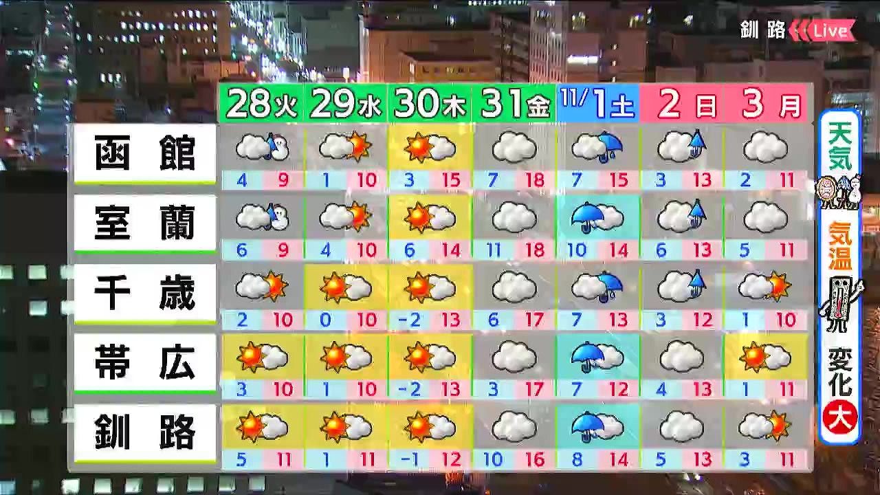 釧路では穏やかそうですね。ただ、朝晩は0度前後まで気温の下がる日があります。