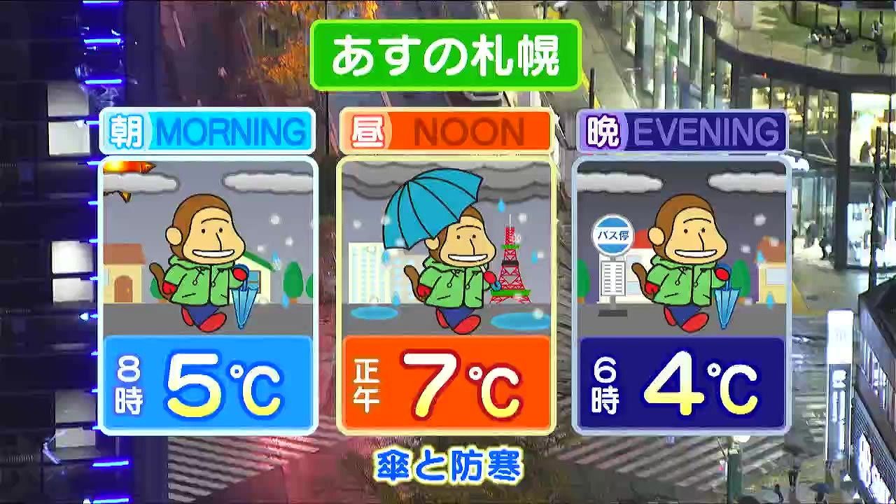 札幌も雪ですね。雨や雪が降ったりやんだりで、傘が必要です。中心部で雪が積もることはないですが、特に朝晩は濡れた路面の凍結に注意が必要です。最高気温はきょう27日(月)より8度も低い7度です。しっかり防寒もしてください。