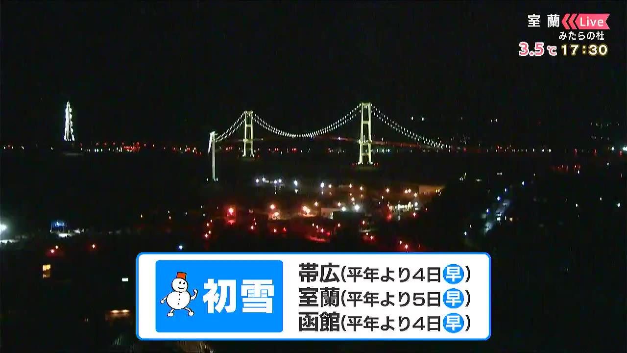 室蘭です。きょう28日(火)は帯広と室蘭、函館で初雪を観測しました。いずれも平年より早い観測です。