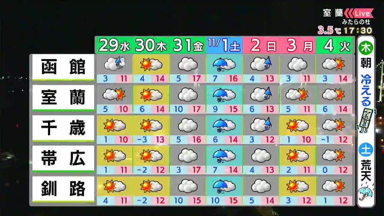 木曜は晴れますが、朝は釧路でも‐2度まで気温が下がるでしょう。土曜は荒れた天気で、警報級の雨や風となりそうです。