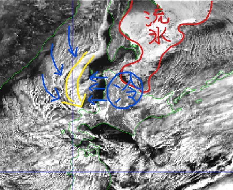 この日の朝はオホーツクの遠軽町生田原で-30.9度まで下がるなど、強烈に冷えました。内陸から吹き出す風と季節風がぶつかり、積丹半島周辺に集中して雪雲を流しています。