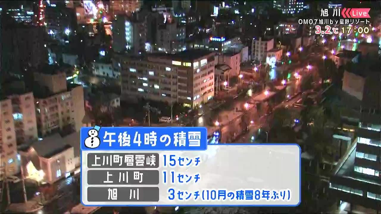 旭川では草の上に雪が残っていますね。雪や雨のピークは過ぎていますが、急に雪景色となりましたね。午後4時でも上川町内では10センチ以上の積雪が残っています。旭川は3センチで、10月としては8年ぶりに積雪を観測しています。
