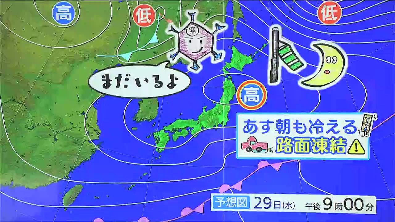 さてこちらは、今夜9時の予想天気図です。雨や雪を降らせた低気圧は北海道から離れ、高気圧に覆われます。今夜は風が弱く穏やかに晴れますが、上空の寒気くんが「まだいるよ」と言って居座っています。このため、今夜からあす30日(木)朝も冷えますので、濡れた路面の凍結に注意して下さい。