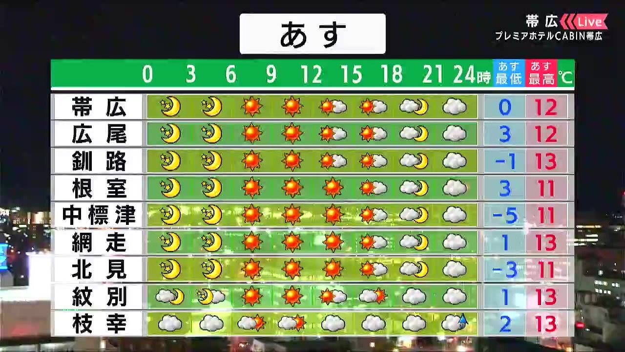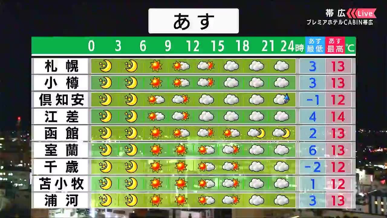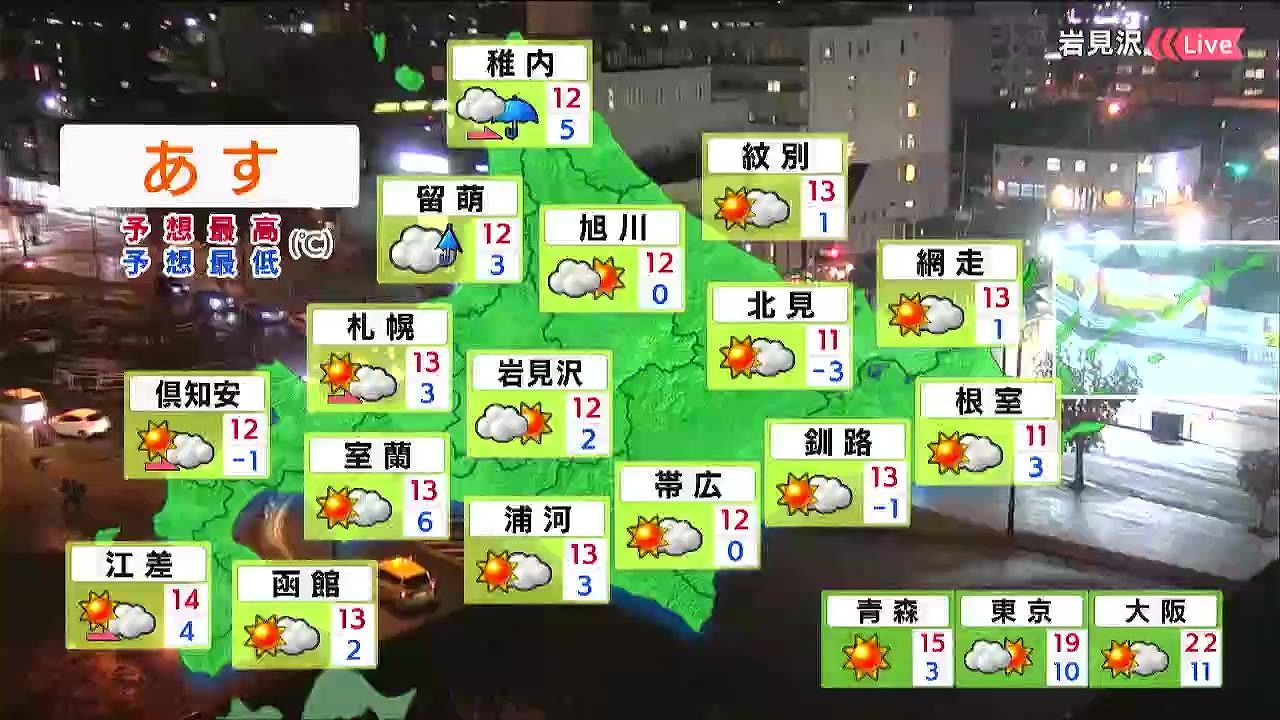 昼頃まで各地で晴れるでしょう。夜遅くは倶知安方面で弱い雨が降りそうです。朝は千歳で-2度と冷えますが、日中は札幌など13度くらいまで気温が上がるでしょう。