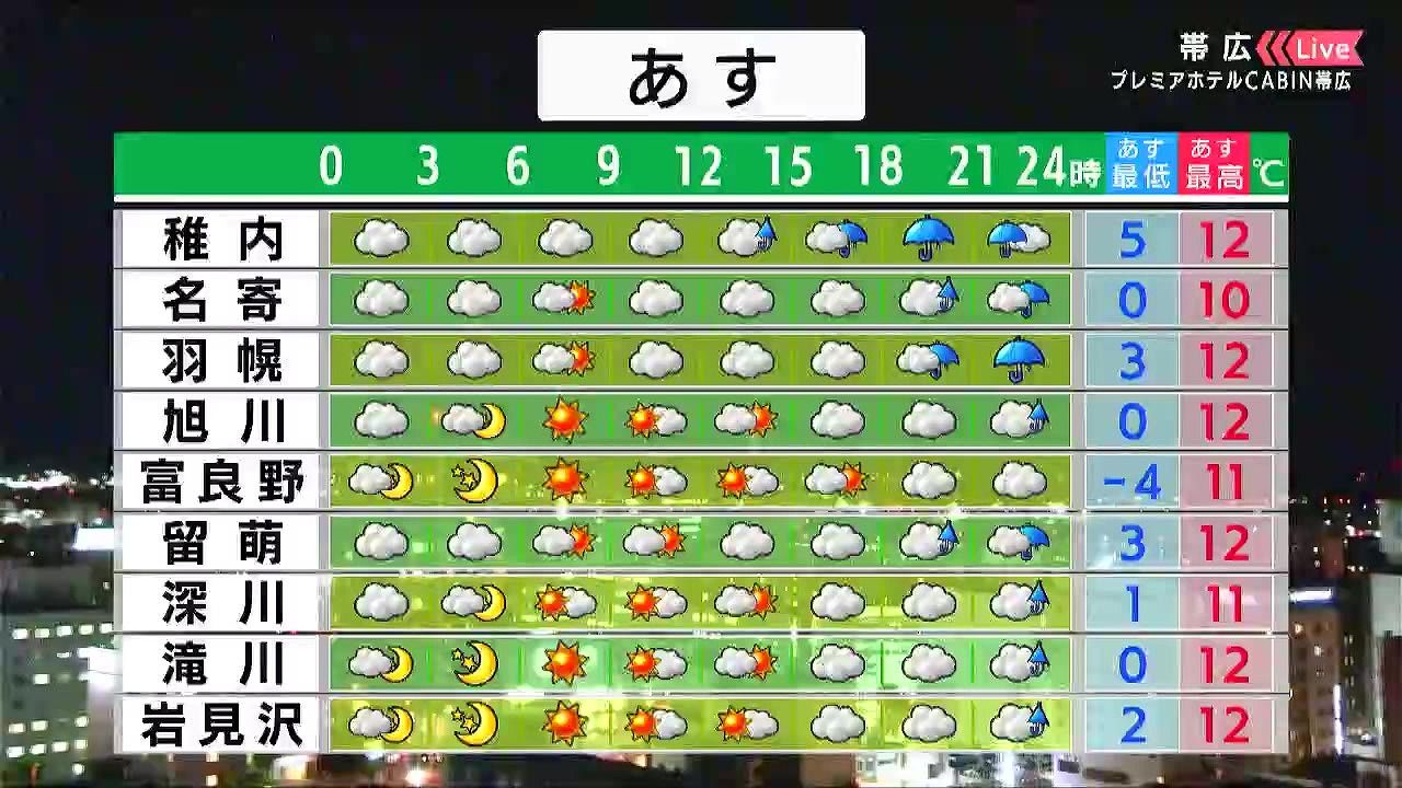 内陸は晴れますが、朝は0度前後と冷えるため、路面凍結に注意して下さい。宗谷地方は昼過ぎから雨、その他も夜9時前後から雨が降り出し、激しい雷雨や突風、ひょうにも注意が必要です。