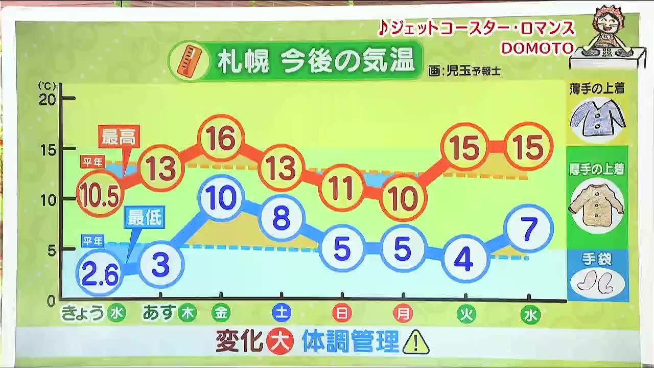 その後は、ジェットコースターのように気温のアップダウンが大きくなるんです。服装の目安も付けてみましたよ。金曜は最低10度、最高16度で朝は手袋なし、薄手の上着で出かけられそうです。ただ、3連休は徐々に寒さが戻り、文化の日の月曜の最高気温は10度で、きょう29日(水)と同じくらいです。連休明けは再び気温が上がりそうです。気温差で体調を崩さないよう、気を付けましょう。