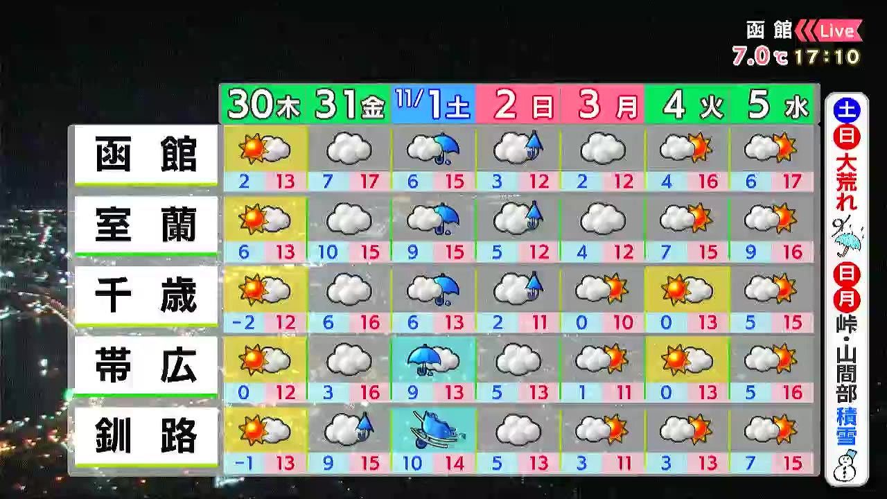金曜の夜は釧路で雨が降り出し、土曜は釧路で暴風雨マーク。道東を中心に大荒れとなりそうです。日曜も午後を中心に雨が降るでしょう。土曜は最低気温でも10度くらいです。布団選びも気を付けましょう。