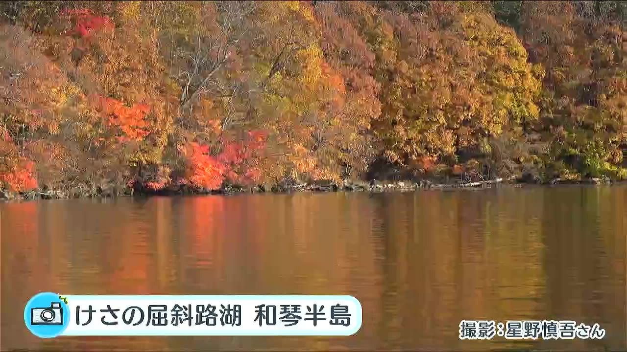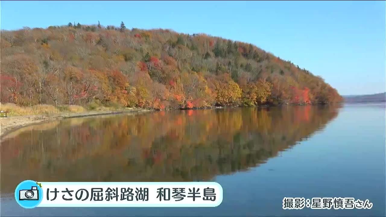 こちらは弟子屈町の屈斜路湖に突き出た和琴(わこと)半島でけさ撮影された映像です。青空に紅葉が映えて、穏やかな湖面にも鏡のように紅葉が映り込んでいます。和琴半島での紅葉が終わると、弟子屈町にもいよいよ冬がやってくるということです。