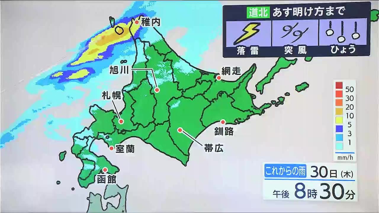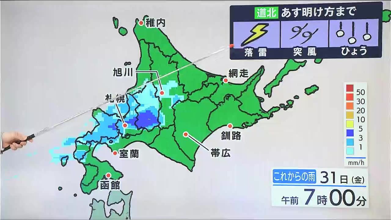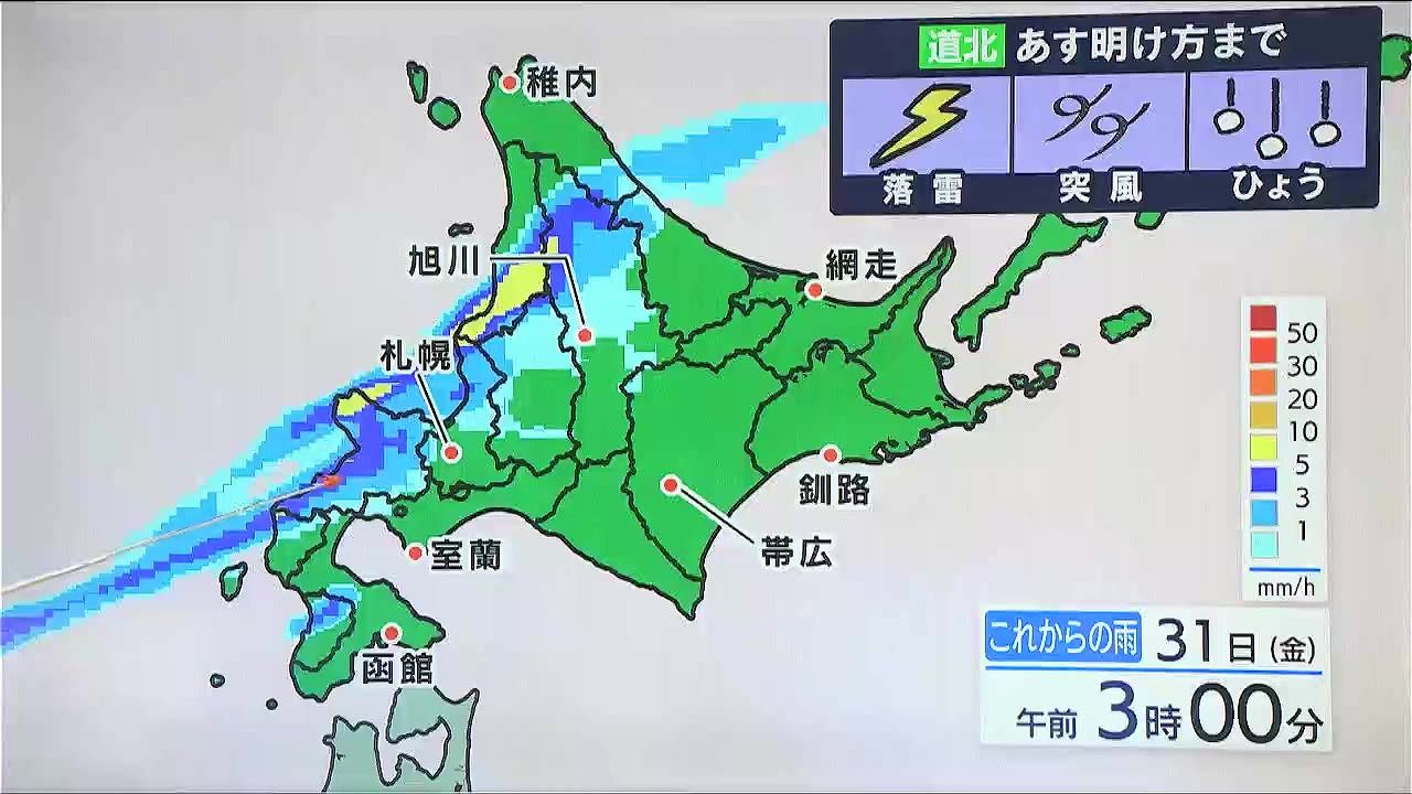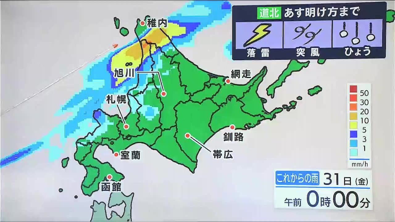 あす31日(金)にかけてしだいに雨雲が札幌など道央に南下するでしょう。道北を中心にあす明け方にかけて落雷や突風、ひょうにも注意して下さい。