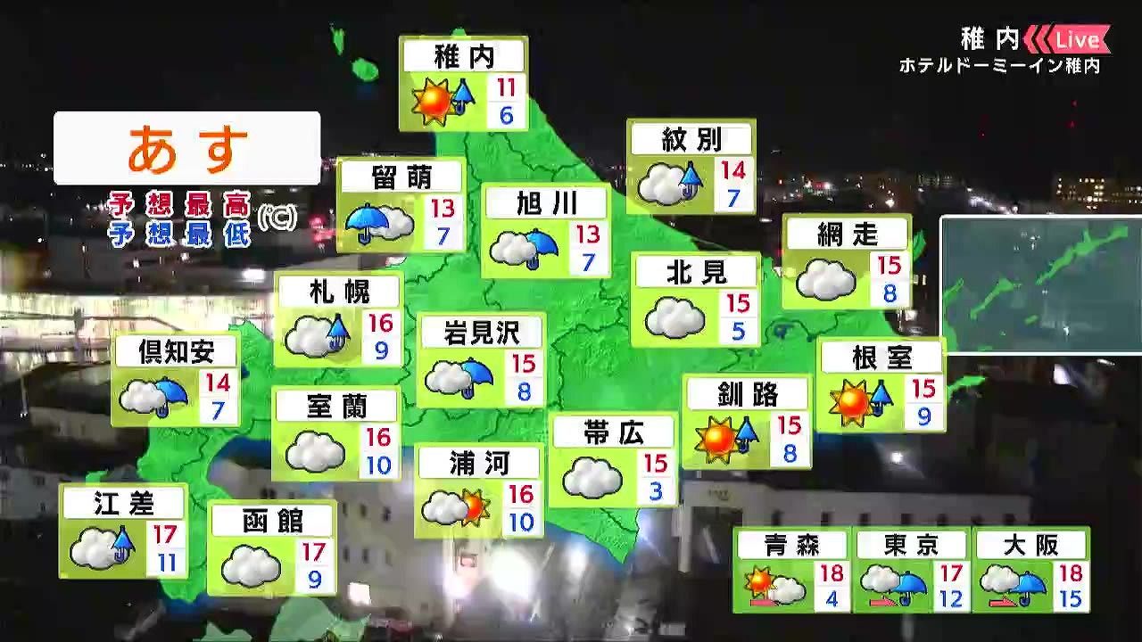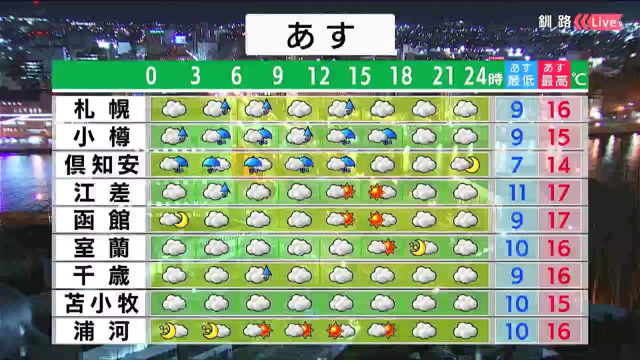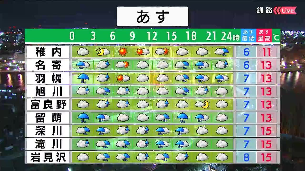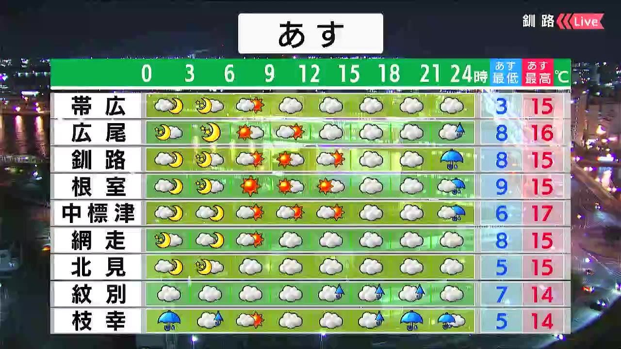 道東は晴れますが、夜9時以降は雨が降るでしょう。紋別や道北の枝幸でも雨の降る時間があります。最低気温は十勝の内陸で0度くらいまで下がりますが、日中は15度前後でしょう。