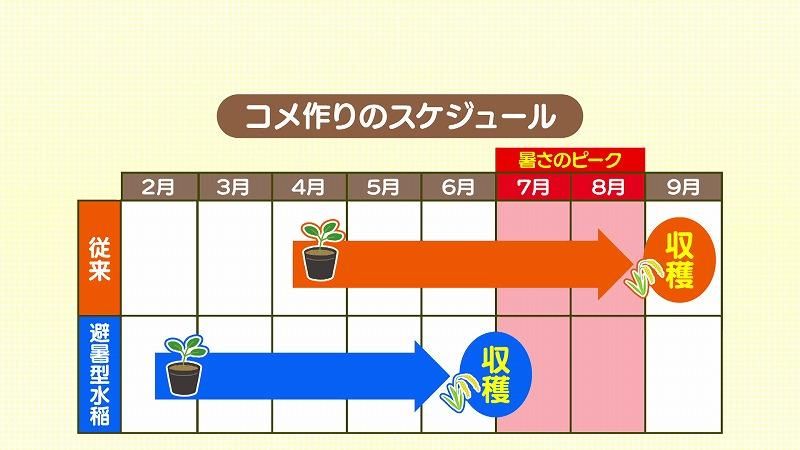一方、研究チームが提案する「避暑型水稲」は、一連のコメ作りの行程を2か月ほど前倒しすることで暑さがピークを迎える7月、8月を前に収穫をしてしまいます。