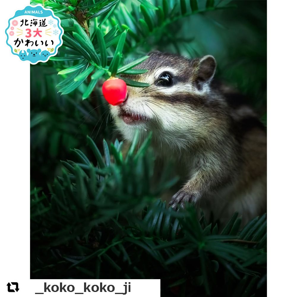 たったひと粒だけ残ったオンコ(イチイ)の実を見つけて、ご機嫌なエゾシマリス。
