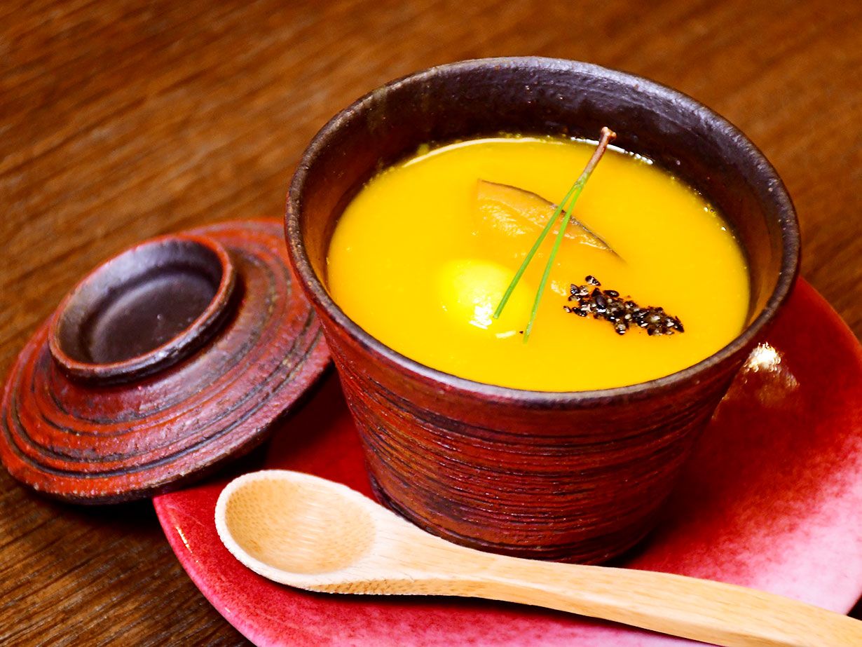 甘いカボチャが鶏出汁の優しい風味と調和して、上品な和の味わいに!ソースも手間をかけた分、非常に滑らかで贅沢な舌触りになっています