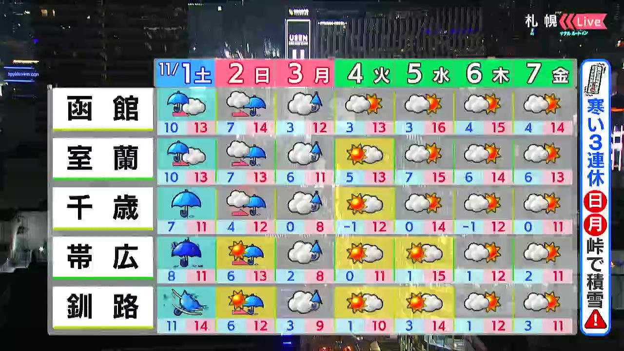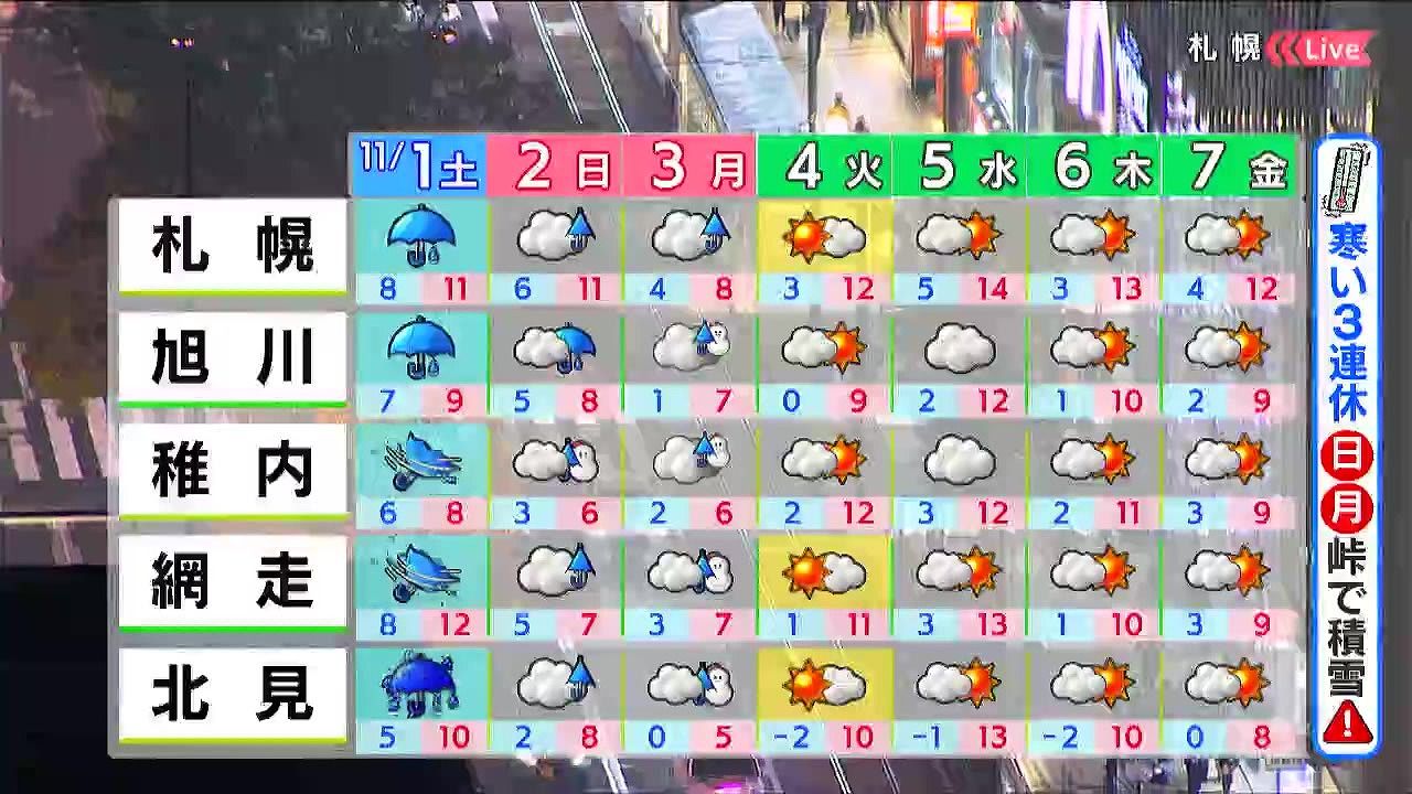 日曜は朝晩を中心に雨で、稚内は雪がまじります。月曜はオホーツク海側を中心に雨や雪が降り、峠では雪が積もるでしょう。寒い3連休です。