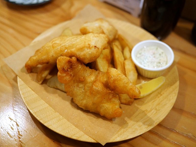 こちらが看板メニューのフィッシュ&チップス。今日のフライはタラでした。早速一口食べてみたら思いのほか軽い食感でビックリ!(何せ、揚げ物を食べ過ぎると胃もたれするお年頃なので^^;)