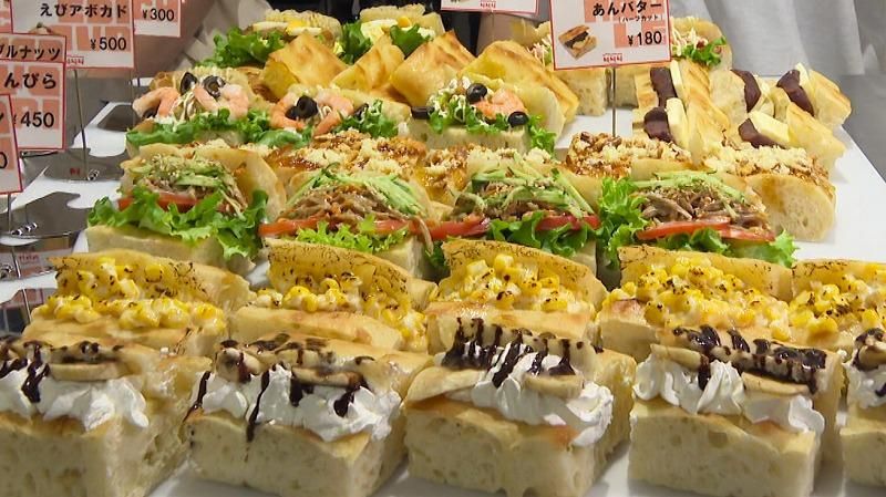フォカッチャにはさむものはアボカドとエビや、コーンが香ばしく香る一品、スイーツ系のチョコバナナまで。