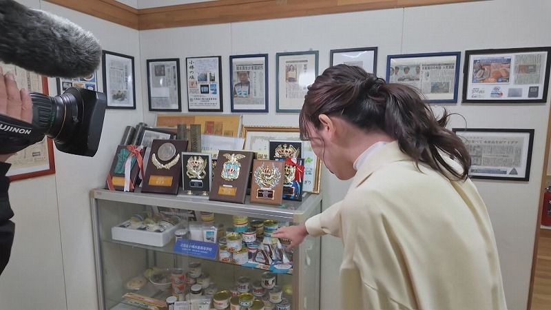 金城アナ:「ちょっと見てください!トロフィーがずらっとならんでいます。そして下を見ると缶詰や食品がずらっと並んでいます」