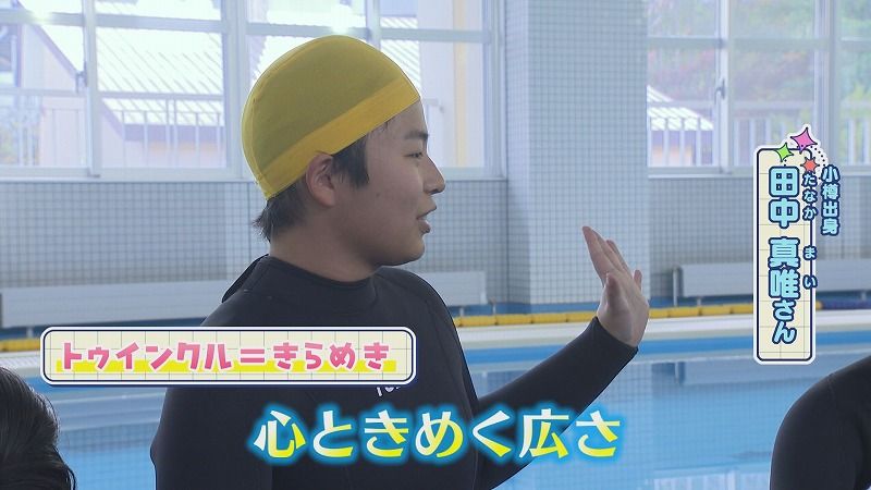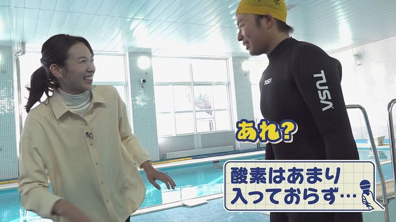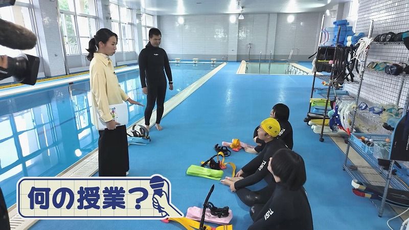 金城アナ「立派な室内プールがありますが…!みなさんウェットスーツを着てる!これから何の授業?」