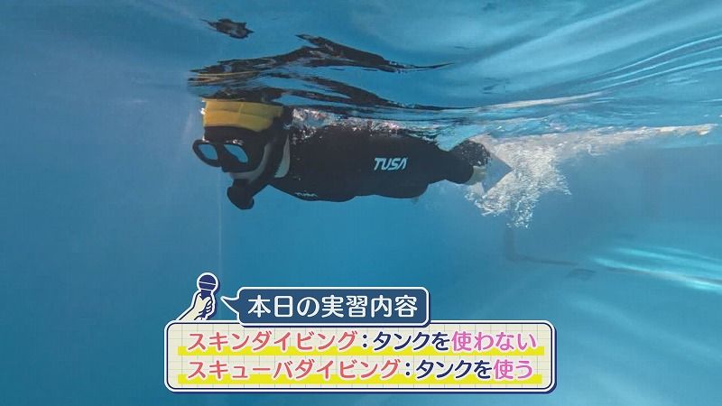 先生:「今日は重い機材を使わない、スキンダイビングといわれる練習と実際に機材を背負うスキューバダイビングの実習をおこなっています」