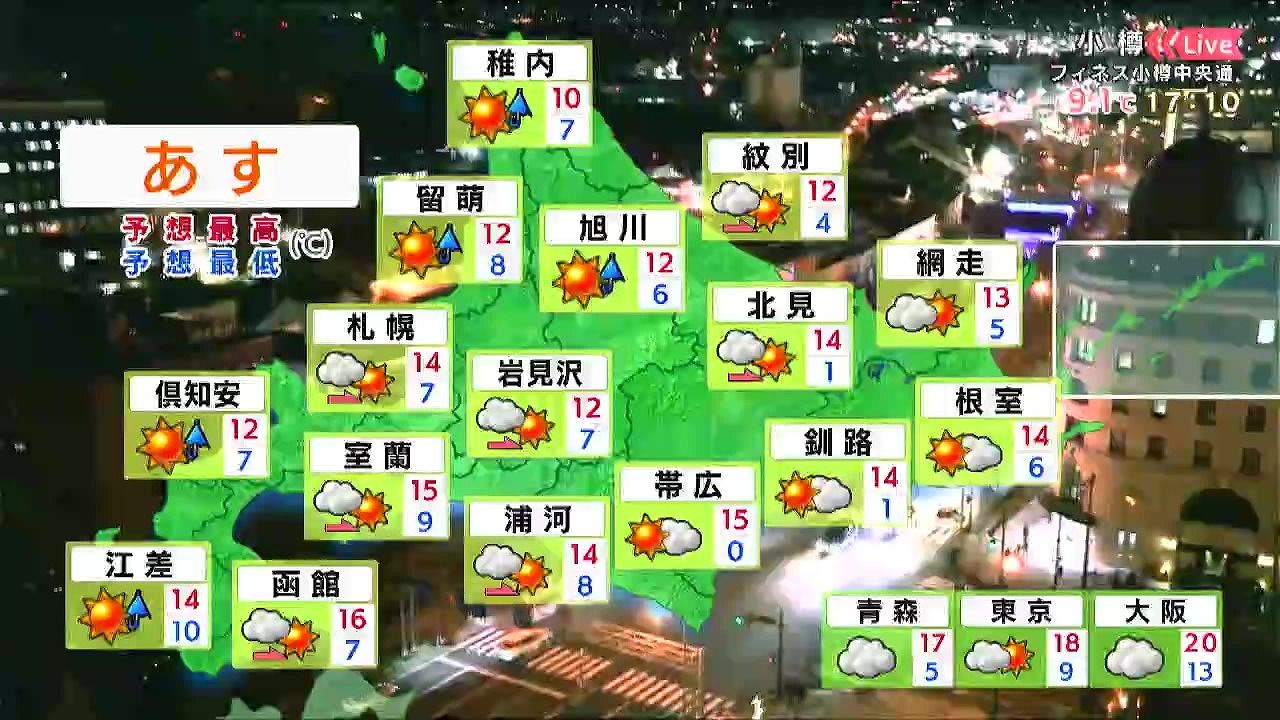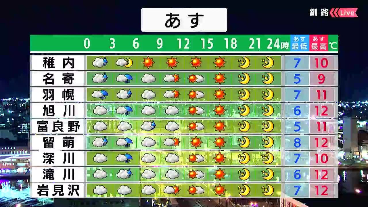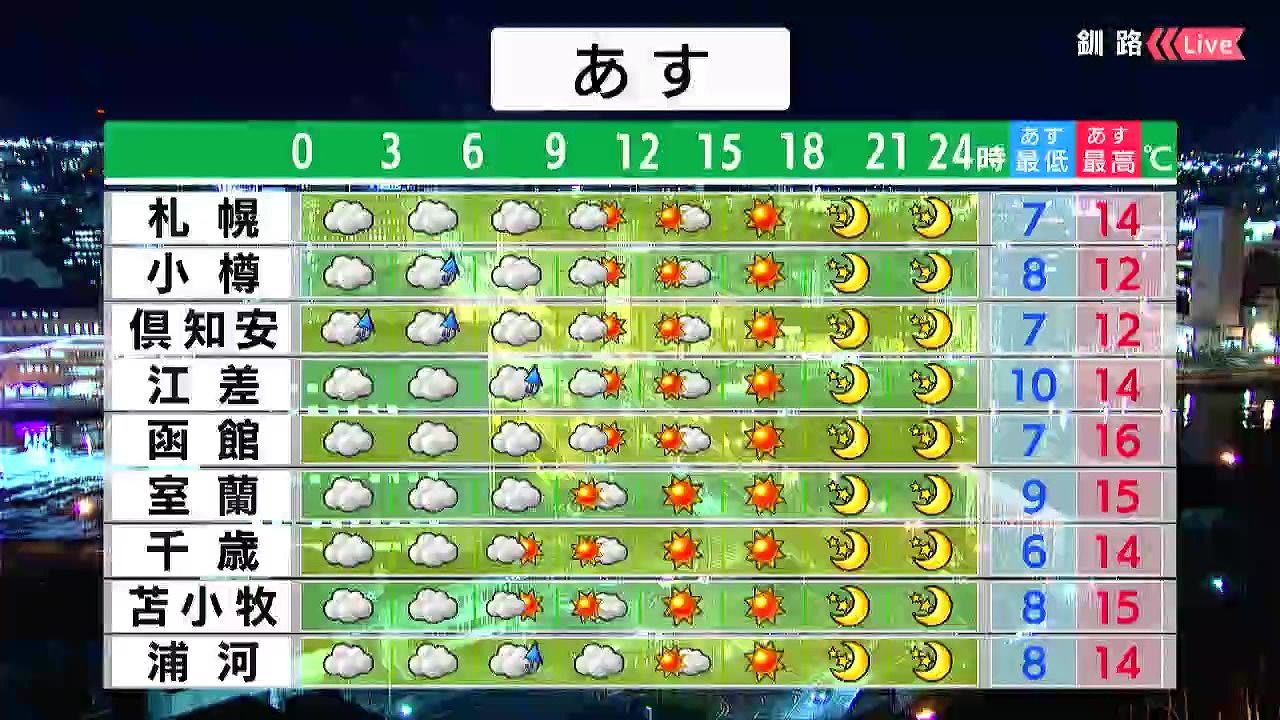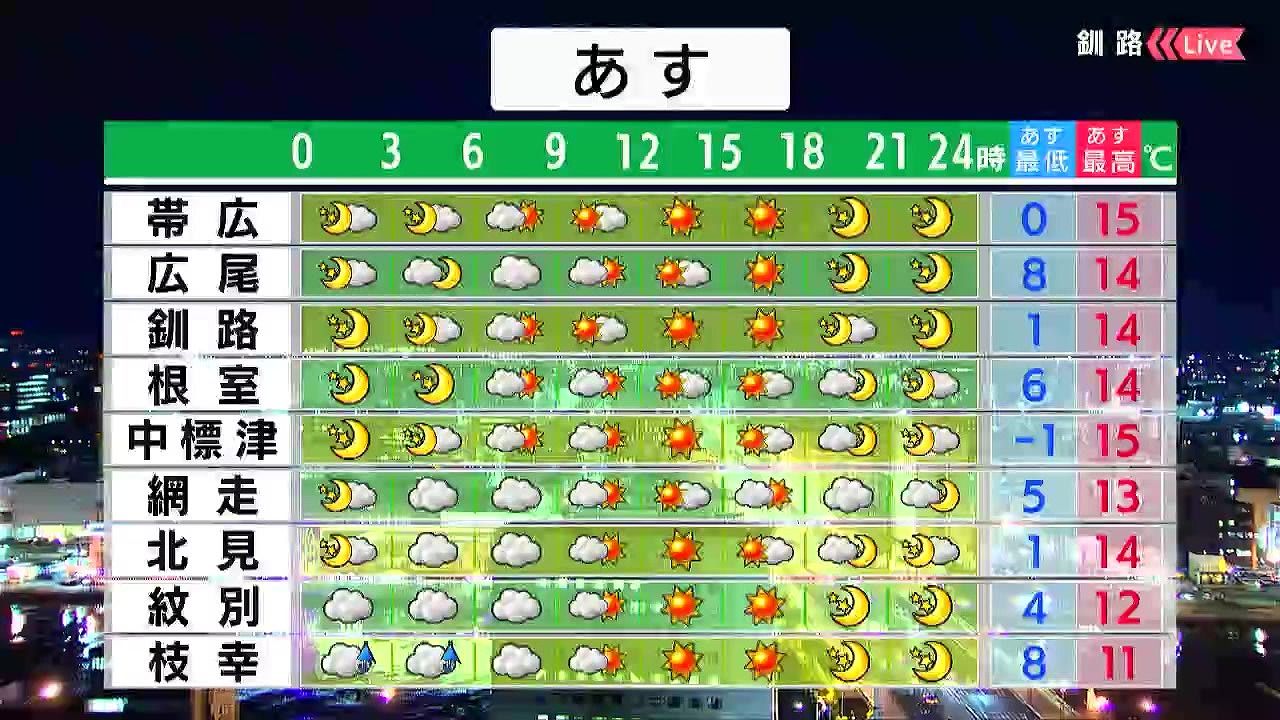 朝は雨の降るところがありますが、日中は各地で晴れるでしょう。最低気温はけさより大幅に高く、帯広で0度の他はプラスです。日中は14度前後まで上がるでしょう。