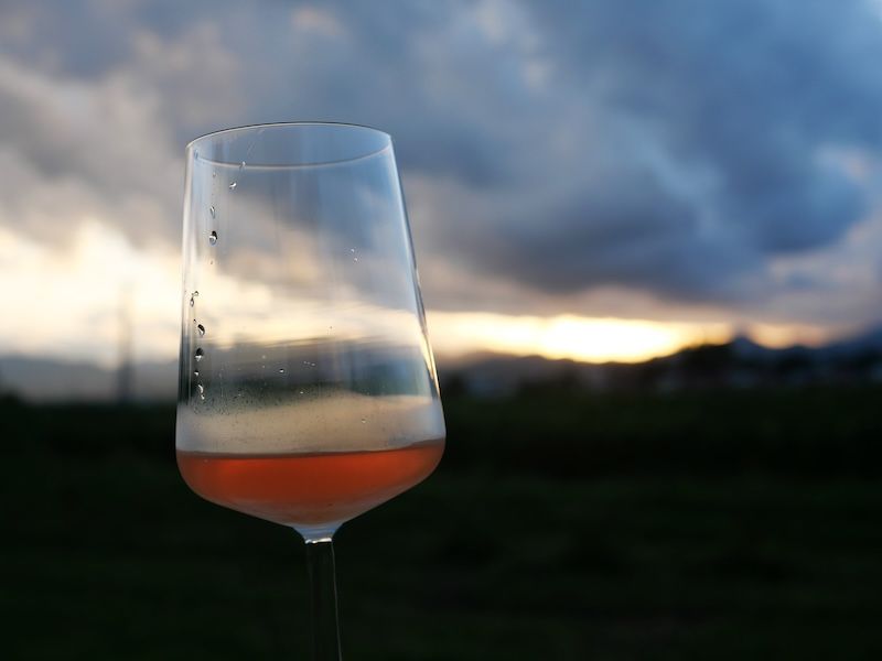 沈む夕日を眺めながら頂いた、メルロ ブラン・ド・ノワール2024の美しさは一生の思い出となりました。