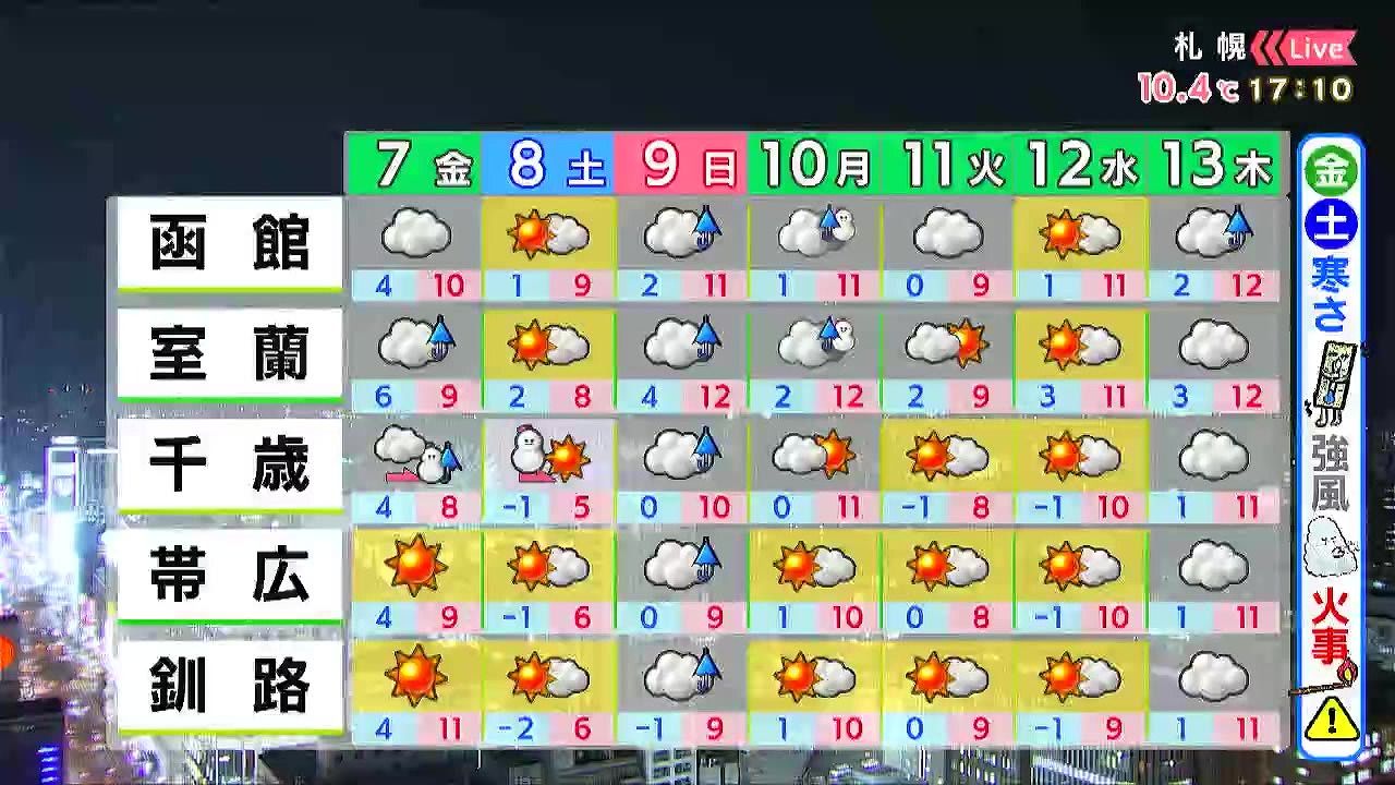 千歳で土曜の朝まで雪が降りますが、交通に影響が出るほどではないでしょう。その他は土曜もカラッと晴れて、寒さが続きます。火の取り扱いも注意して下さい。