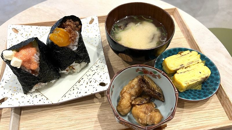 おにぎりだけでも、もちろんごほうび感がありますが、そこにお味噌汁、おかず2種(玉子焼き、鶏肉とごぼうのかりっと甘辛だれ)のセット(900円)をプラスすると、まるで“おにぎり定食”のようにもなり、より満足度がアップ!